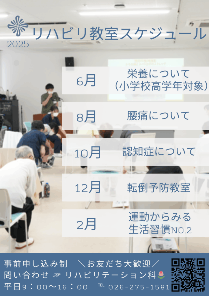 長野寿光会リハビリ教室では、地域住民の方々が健康で快適な生活を長く送るためにリハビリスタッフが中心に有益な情報や運動を提供しています。
