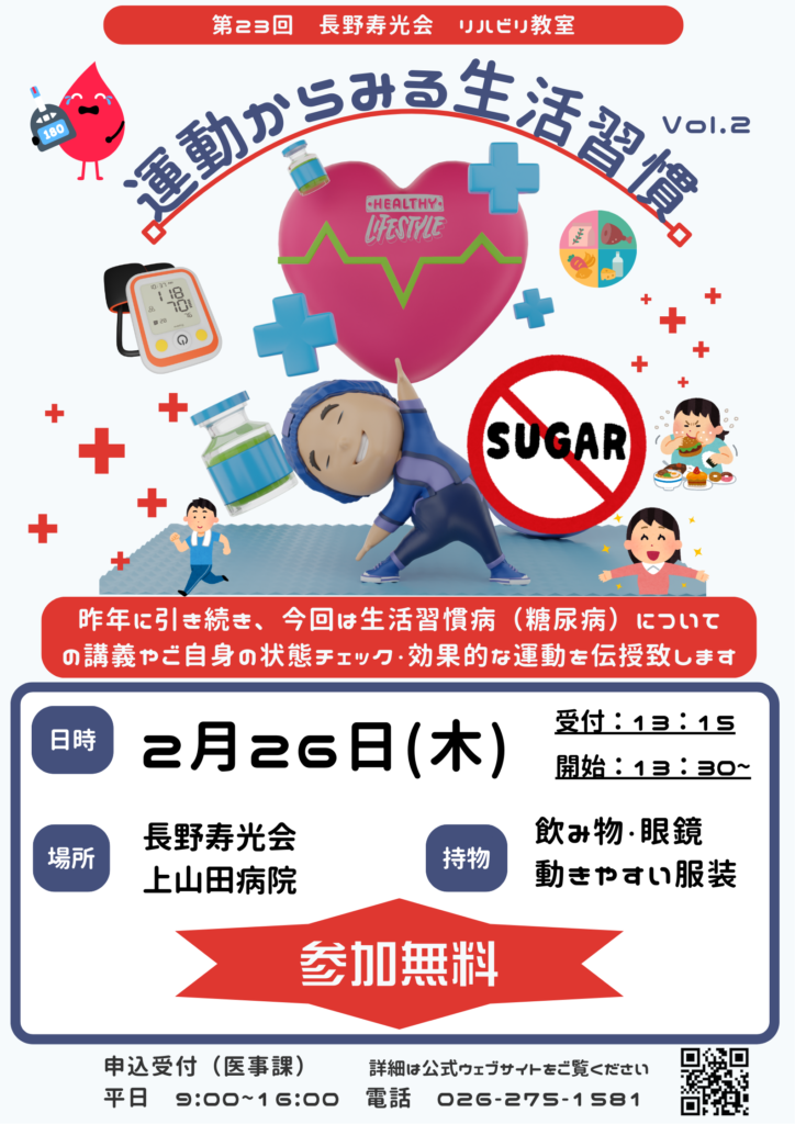 第23回リハビリ教室 運動からみる生活習慣 Vol.2 参加者募集中! 2026 1/28 お知らせ 第23回となります長野寿光会リハビリ教室、今回のテーマは「運動からみる生活習慣 Vol.2」です。現在、参加者募集中です。みなさま奮ってご参加ください。 開催日:2026年2月26日(木) 時間:受付13時15分~、開始15時30分 場所:上山田病院 お申し込みはこちら お知らせ